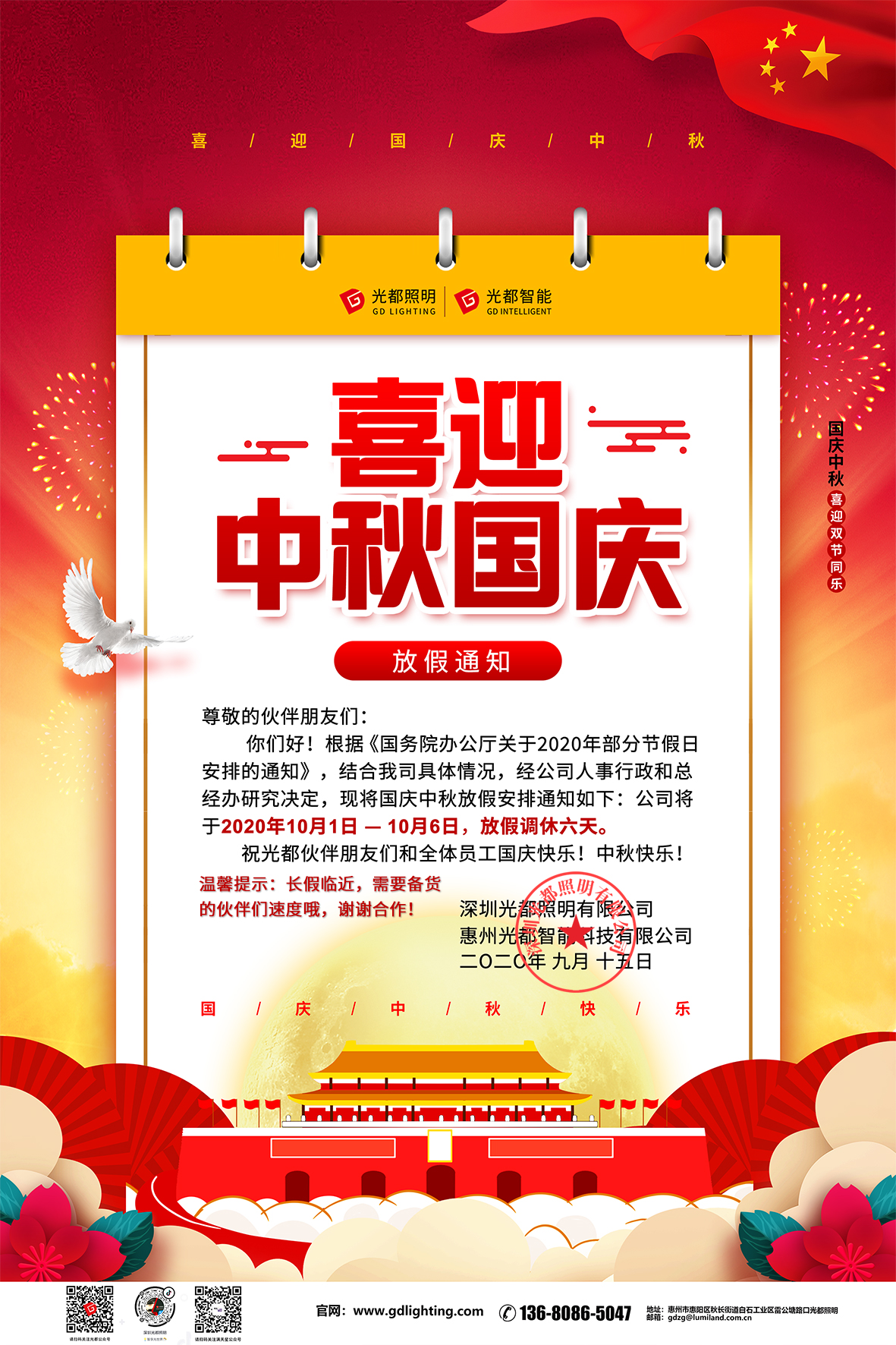 溫馨提示:光(guāng)都(dōu)中秋國(guó)慶放(fàng)假時(shí)間(jiān)為(wèi)10月(yuè)1-6日(rì),2020愛(ài)您們哦~!萬家(jiā)團圓迎中秋,四€海(hǎi)歡騰慶國(guó)慶!值此雙節來(lái)臨之際,光(guāng)都(dōu)全體(tǐ)員(yuán)工(gōng)恭祝夥伴朋(pén≥g)友(yǒu)們中秋快(kuài)樂(yuè),阖家(jiā)幸福!喜迎共和(hé)國(guó)71周年(nián)華誕,祝願偉大(dà)祖國(guó)神州大(dà)地(dì)花(huā)似錦,國•(guó)強民(mín)盛家(jiā)繁榮,祖國(guó)母親生(shēng)日(rì)快(kuài)樂÷(yuè),光(guāng)都(dōu)人(rén)與您同在!