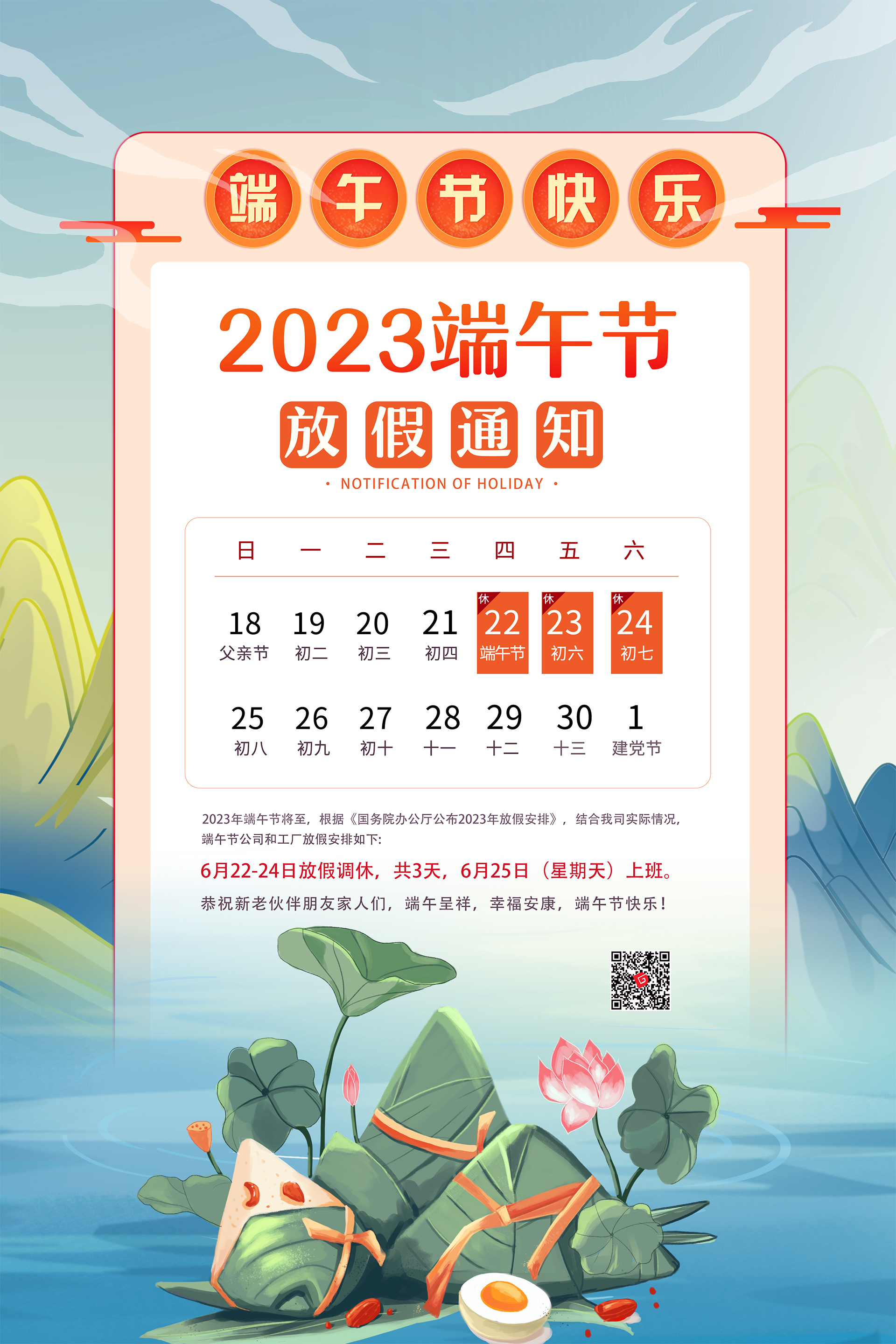 光(guāng)都(dōu)照(zhào)明(míng)|光(guāng)都(dōu)智能(néng)|光(guāng)都(dōu)光(guāng)電(diàn)公司和(hé)工(gōng)廠(chǎng)2023年(nián)端午節6月(yuè)22-24日(rì)放(fàng)≈假調休3天,6月(yuè)25日(rì)(星期天)上(shàng)班。恭祝新老(lǎo)夥伴朋(péng)友(yǒu)家(jiā)人(rén)們,端午呈祥,幸福安康!端午節快(kuài)∞樂(yuè)!